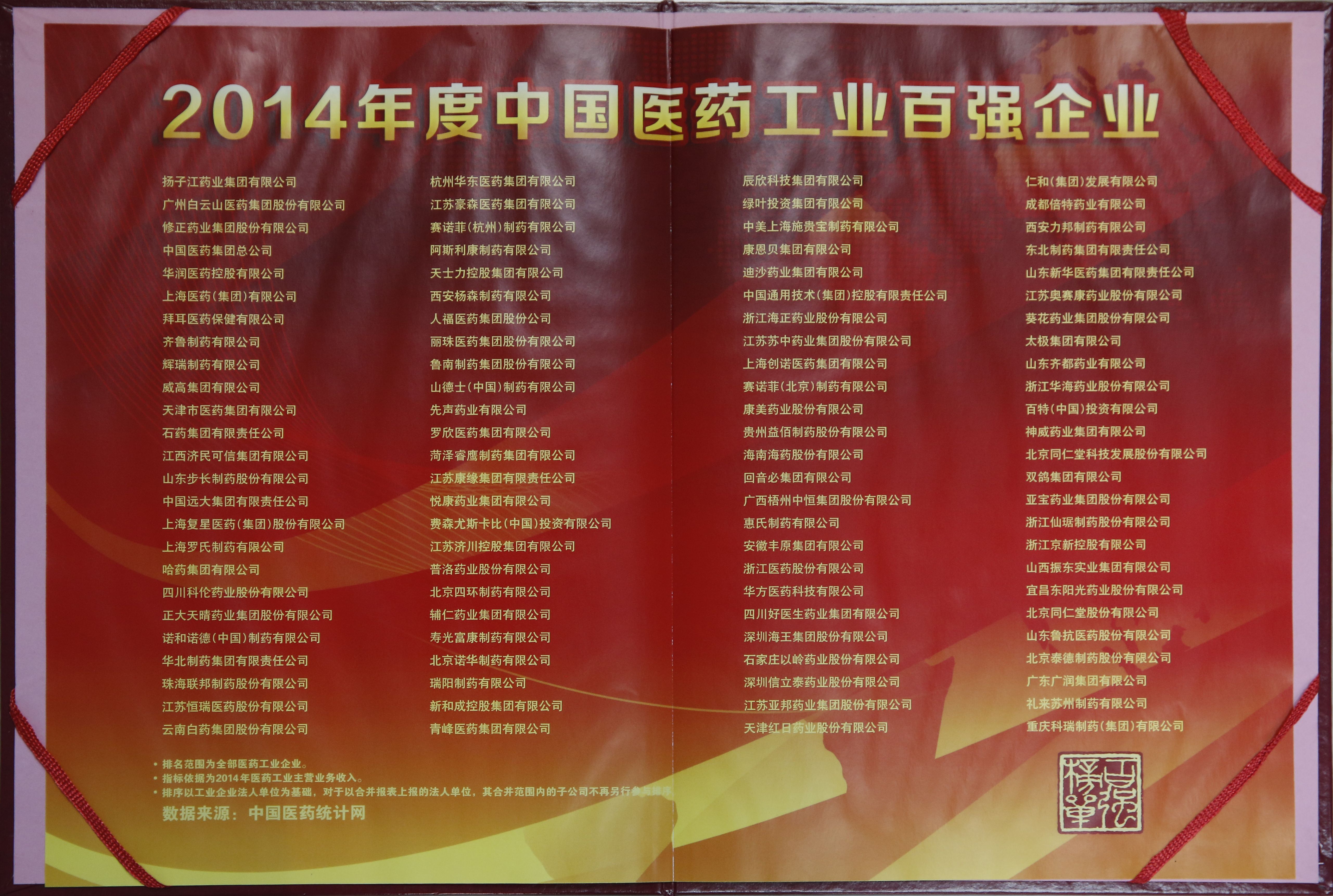 榮獲2014年度中國醫(yī)藥工業(yè)百強企業(yè)稱號