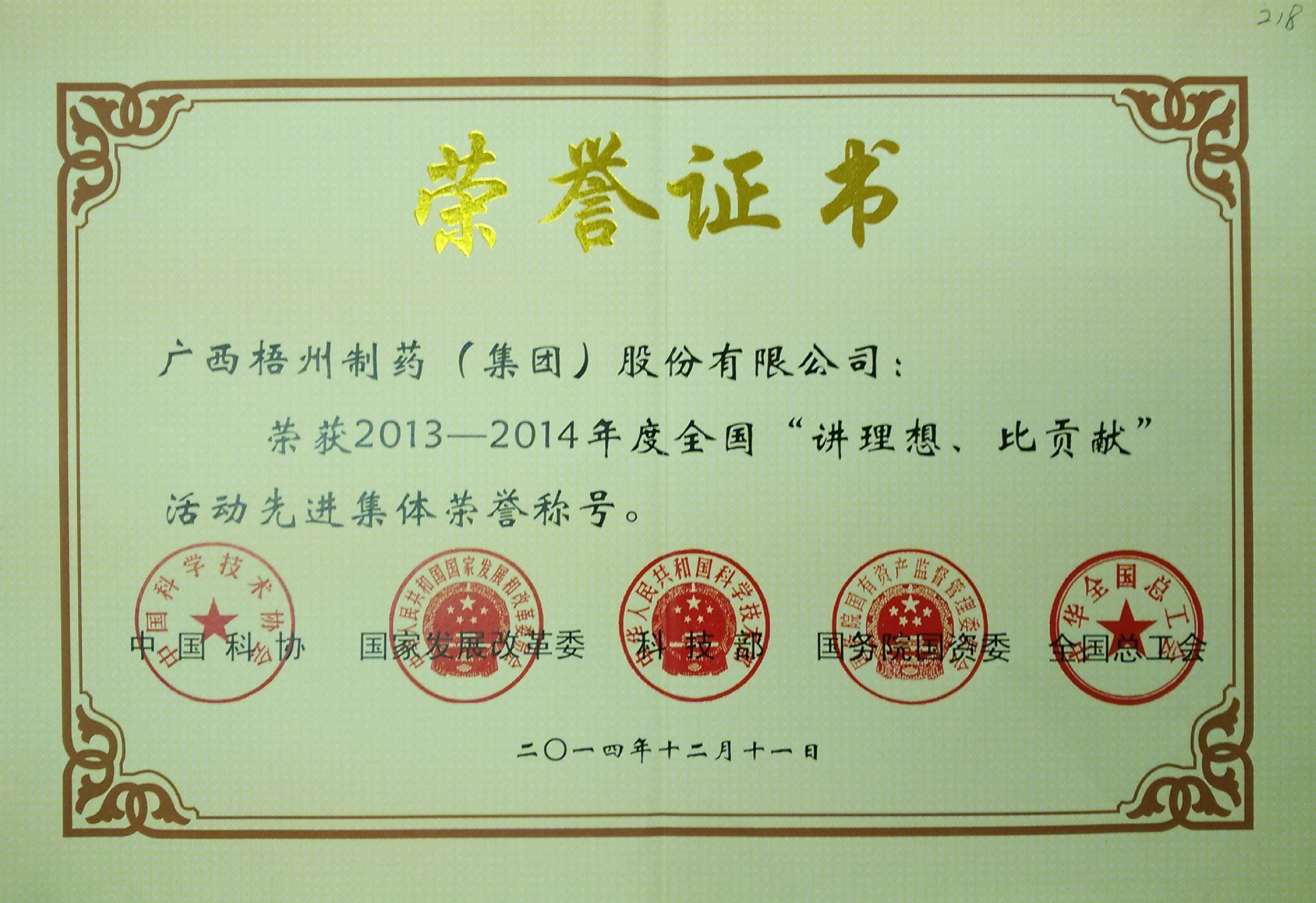 榮獲2013-2014年度全國(guó)“講理想,比貢獻(xiàn)”活動(dòng)先進(jìn)集體榮譽(yù)稱號(hào)