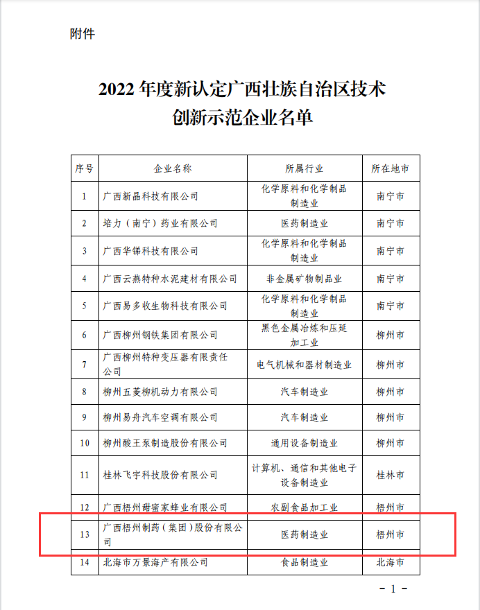 近日,廣西壯族自治區(qū)工業(yè)和信息化廳發(fā)布《自治區(qū)工業(yè)和信息化廳 自治區(qū)財政廳關(guān)于公布2022年度新認(rèn)定廣西壯族自治區(qū)技術(shù)創(chuàng)新示范企業(yè)名單的通知》,梧州制藥榜上有名,獲評為2022年度“廣西壯族自治區(qū)技術(shù)創(chuàng)新示范企業(yè)”。