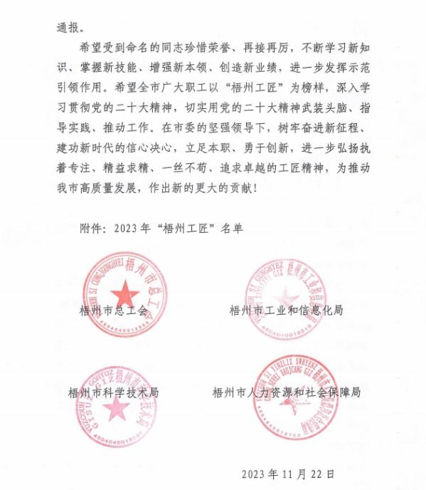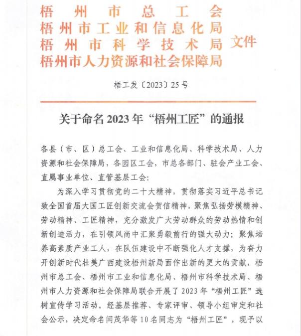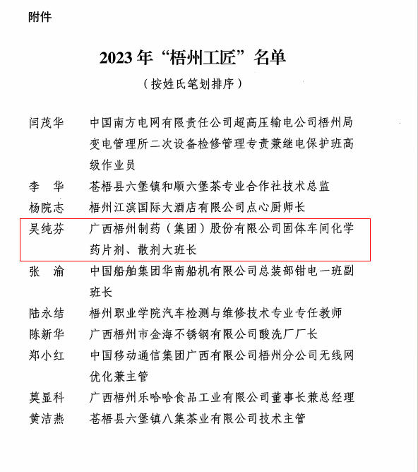 近日,梧州市總工會、梧州市工業(yè)和信息化局、梧州市科學(xué)技術(shù)局、梧州市人力資源和社會保障局聯(lián)合發(fā)布《關(guān)于命名2023年“梧州工匠”的通報(bào)》,梧州市有10名同志被選樹為“梧州工匠”,其中,梧州制藥固體車間化吳純芬獲此殊榮。