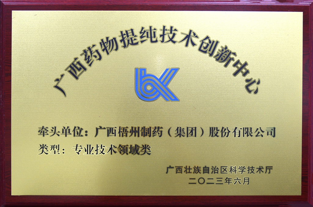 廣西梧州制藥(集團(tuán))股份有限公司在專業(yè)技術(shù)領(lǐng)域類獲評廣西藥物提純技術(shù)創(chuàng)新中心