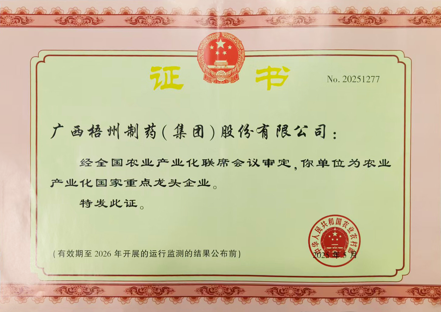 廣西梧州制藥(集團)股份有限公司獲評農(nóng)業(yè)產(chǎn)業(yè)化國家重點龍頭企業(yè)