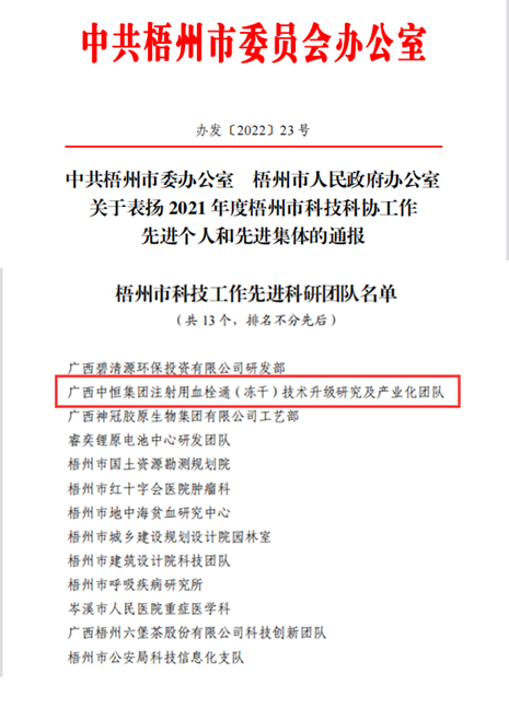 近日,中共梧州市委辦公室、梧州市人民政府辦公室發(fā)布《關于表揚 2021年度梧州市科技科協(xié)工作先進個人和先進集體的通報》,“注射用血栓通(凍干)技術升級研究及產(chǎn)業(yè)化團隊”榮獲“梧州市科技工作先進科研團隊”稱號。