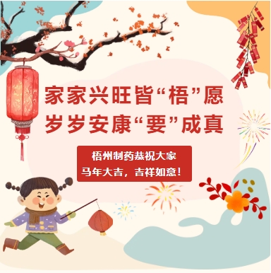 家家興旺皆“梧”愿歲歲安康“要”成真梧州制藥恭祝大家馬年大吉,吉祥如意!午馬迎新 馬年大吉家家興旺皆“梧”愿,歲歲安康“要”成真。躍馬揚(yáng)鞭開新局,一馬當(dāng)先爭(zhēng)一流。梧州制藥恭祝大家馬年大吉,吉祥如意!END圖文丨潘